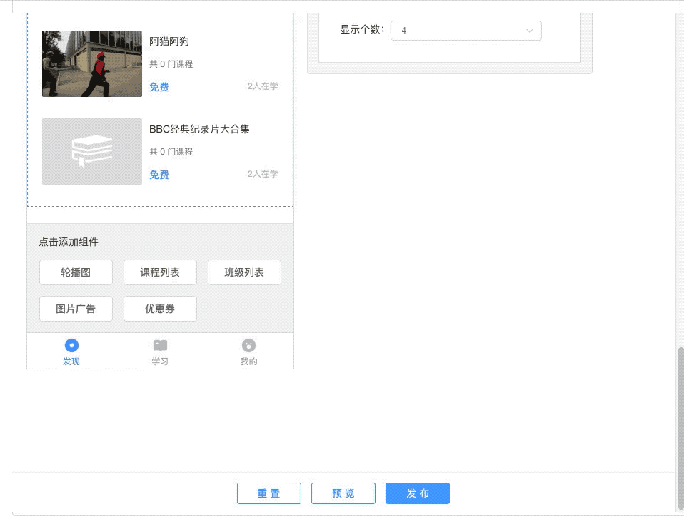 微网校/小程序页面增加优惠券组件,网校管理员可以在管理后台手动添加需要展示的优惠券,添加优惠券之后,学员可以通过发现页优惠券组件领取或者在小程序/微网校的课程详情页中查看并领取对应商品可用的优惠券。
