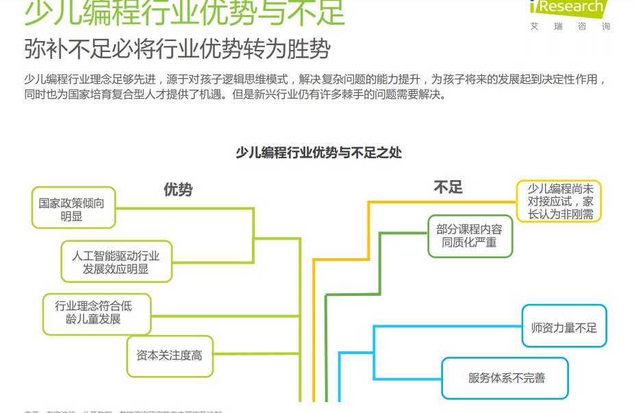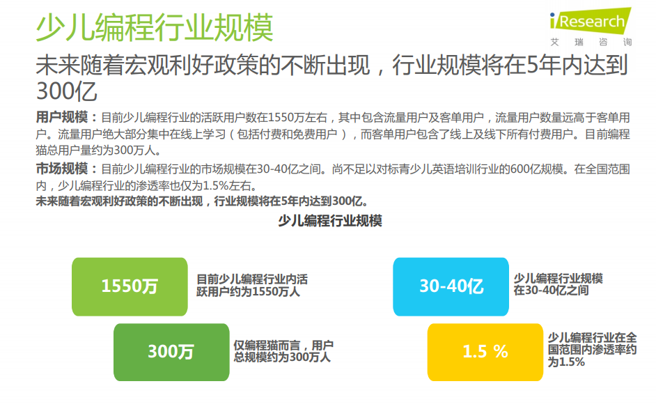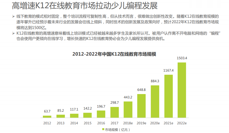 高增速K12在线教育市场拉动少儿编程发展;未来随着宏观利好政策的不断出现,行业规模将在5年内达到300亿;弥补不足必将行业优势转为胜势。