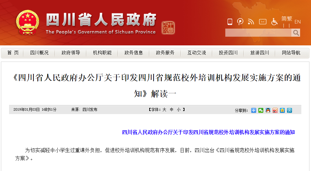 日前,四川省政府办公厅印发《四川省规范校外培训机构发展实施方案》,进一步规范四川省校外培训机构(面向中小学生的校外培训机构)办学行为,重点对“存在安全隐患、证照不全、强化应试、培训结果与招生入学挂钩、非零起点教学、教师课上不讲课后到培训机构讲”等方面问题进行专项整治。将于2019年6月底前,完成校外培训专项督查任务,建立健全校外培训机构监管机制。