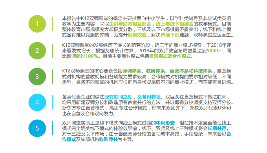 双师课堂实质上是线下模式向线上模式过渡的中间形态,但在技术发展至能让线上模式完全媲美线下模式的体验效果前,线下、双师及线上三种模式将会长期并存。对于三线及以下市场,由于自建双师分校的各项成本高昂,手续复杂,未来会以合作模式及头部机构收购兼并为主导。