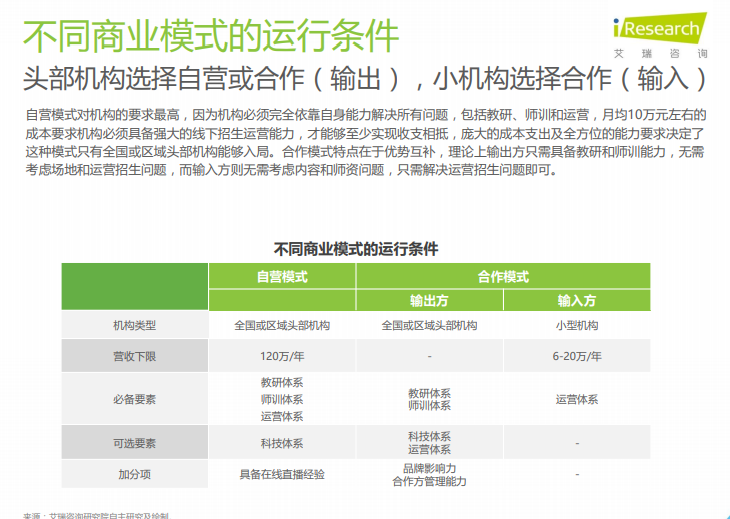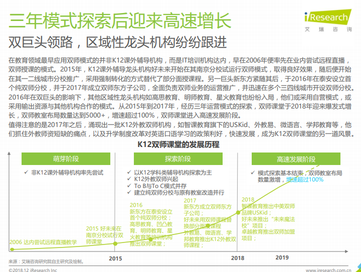 K12双师课堂的发展经历了漫长的萌芽阶段,近三年的商业模式探索,于2018年迎来爆发式增长,同比增长率超过100%。目前K12双师课堂的商业模式包括自营及合作两种,自营模式对机构的营收规模和各项能力要求较高,合作模式对机构的要求相对较低,不同类型、具备不同禀赋的机构应根据自身状况采取不同的商业模式,而不能盲目进场。