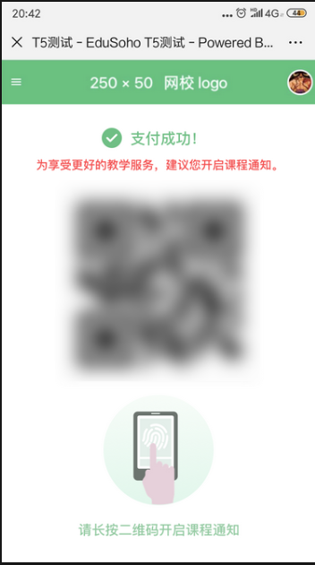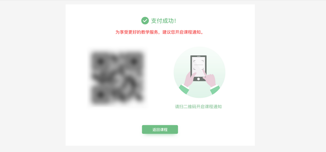任何学员,在首次购买后都会跳转关注服务号提醒。并且我们在网校前台多处位置进行了服务号推广提醒,即使学员跳过了一两个也不怕。