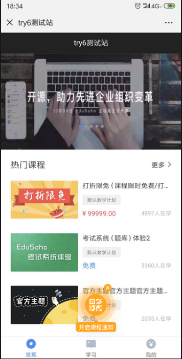 微信通知功能的推出,融合了目前国内最活跃的信息交流平台--微信,也因此能够大大提升通知消息的打开率乃至以此为范本,做其他功能项目升级,以触发整个教育行业教与学的效率提升。目前能够做到与微信平台融合的在线教育软件寥寥无几,创新驱动网校系统功能升级,也是EduSoho不变的理念。