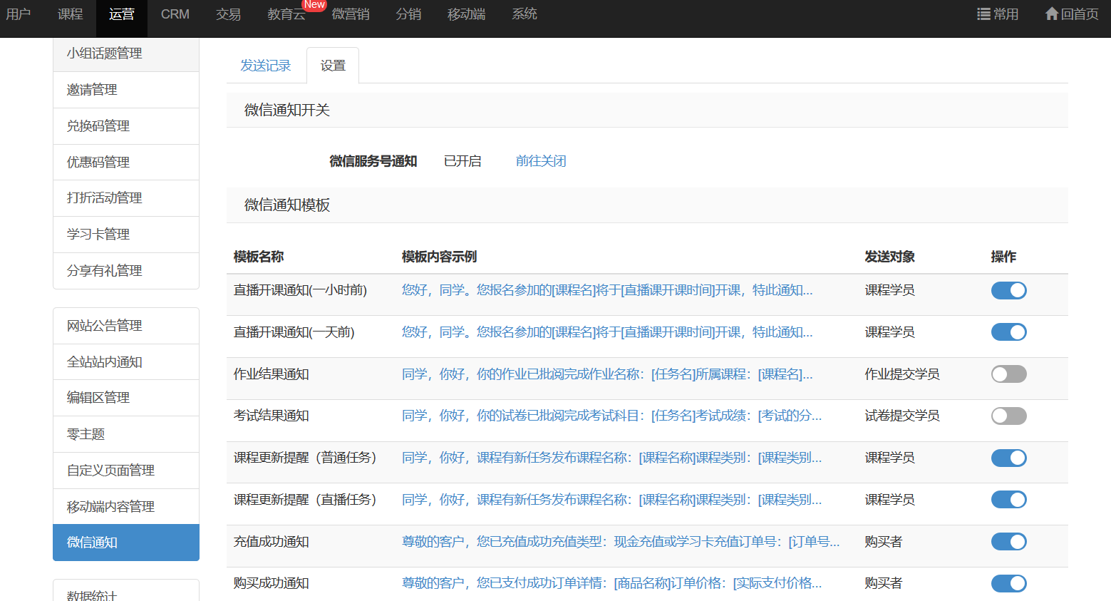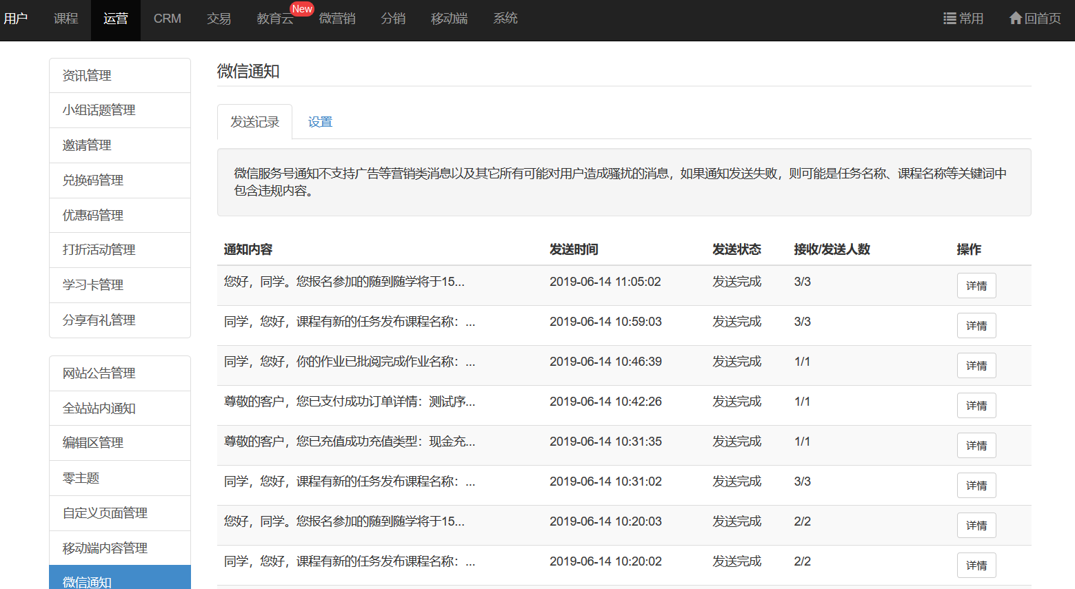并且,产品完美的设计理念,极大地方便网校管理。通过后台发送出去的通知,前往后台【运营】-【微信通知】中即可查看。