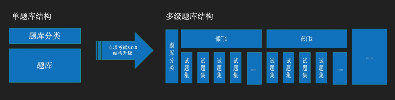 专项考试的题库结构,从单题库结构升级为多级题库结构,每一个部门都可以拥有部门专属的题库,并且为了满足同部门题库内容不同考试目的的题目精细化管理需要,在题库结构中引入“试题集”概念.