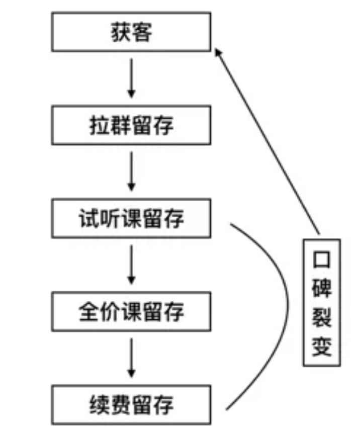 结论下完,我们就可以开始做一个简单的剖析和探讨了。我们首先可以先抛开教研及其他管理问题,粗略看下目前教育行业的前端业务流程链条: