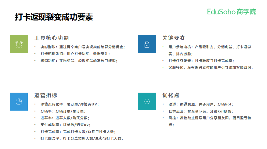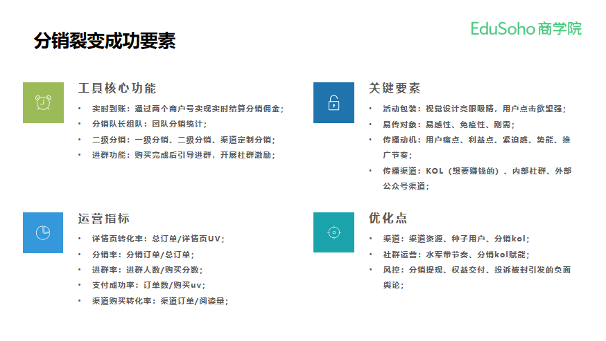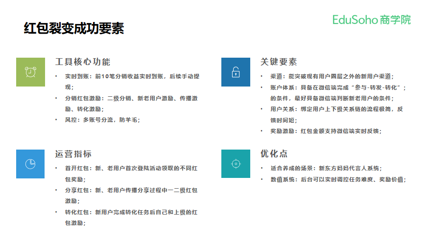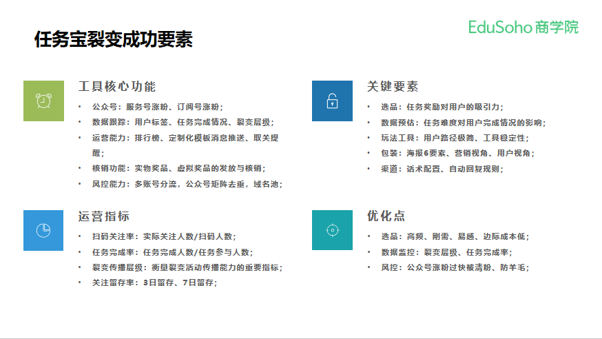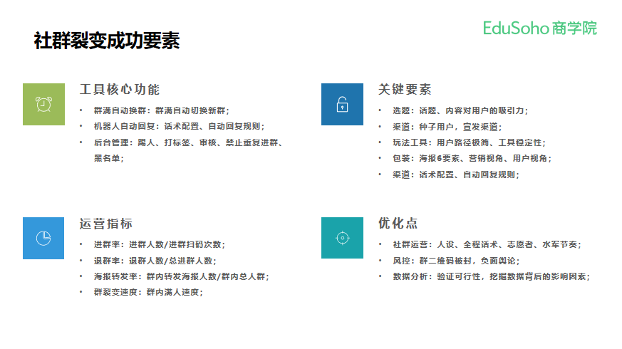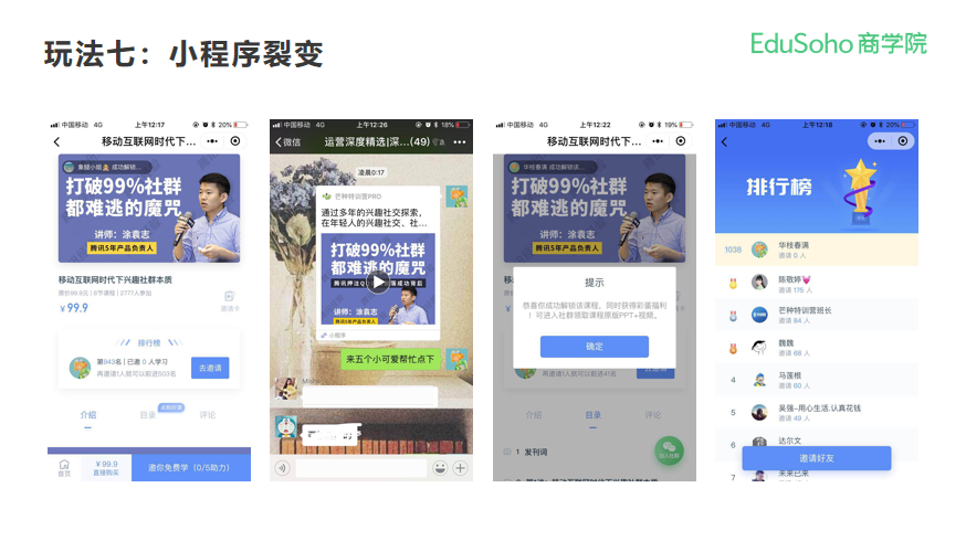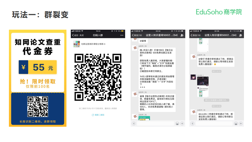 本着为机构校长及运营人员找方法,为机构发展找思路的原则,EduSoho网校系统校长“训练营”第一期课程于7月31日正式开课并圆满结束。课上,零一裂变策划人TIM老师基于微信私域流量,分享了“裂变增长10种玩法”、“裂变增长底层逻辑”以及“裂变增长作战底图”三大板块内容。