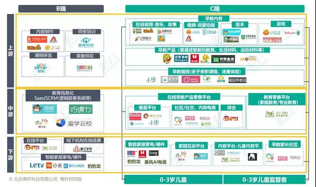 早教行业主要针对的是0-6岁婴幼儿提供家庭教育、早期教育等相关产业,总体特征为:C端专业化低、B端尚未形成规模。企业自研自产自销情况在业内普遍存在,行业整体缺少产业链模块化合作与整合B端服务在质和量上均为满足C端企业需求,造成ToC企业起步发展成本高昂。