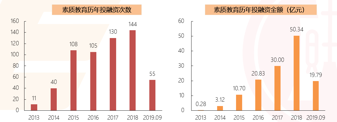 根据广证恒生统计数据,2018年素质教育获投的早期项目占比81%,是教育行业中唯一早期项目大增的赛道。投融资共144起,实现融资额50.34亿元,同比增长54%。其中,STEAM、艺术领域表现突出。2018年至今,素质教育共完成18起单笔亿元及以上的融资,均来自STEAM和艺术教育。