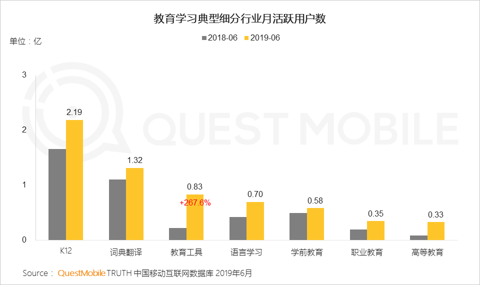 5、应试需求导向,K12行业刚需性强,用户规模约2.2亿;受学习强国APP用户增长的拉动,教育工具行业用户规模增速最快