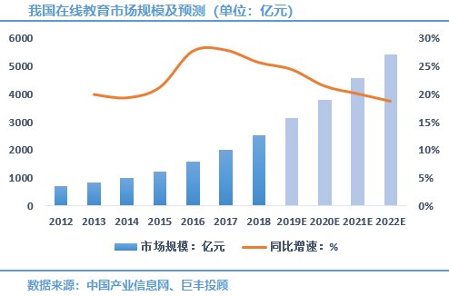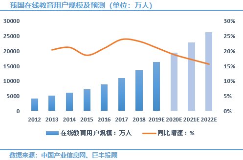 发展受益于互联网的普及,在线教育主要爆发期是在2011年以后。数据显示,目前我国在线教育用户的规模在2018年已达到1.35亿人,同比增速高达23.3%。据预测,其未来3到5年内仍会将保持14%~21%的高速成长。