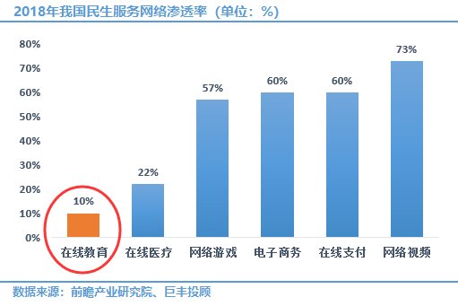 不过与行业高速增长相对应的是,我国在线教育的渗透率却低得可怜。据前瞻产业研究院今年1月中旬搜集的数据显示,中国在线教育的渗透率仍处于较低水平。在我国范围内对比看,目前各个民生服务的网络渗透率均高于在线教育。其中,网络视频的渗透率最高达72%;其次是电商和在线支付,其渗透率均为60%,而在线教育的渗透率仅为10%。