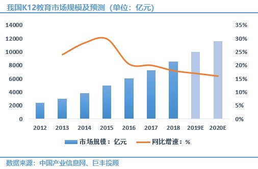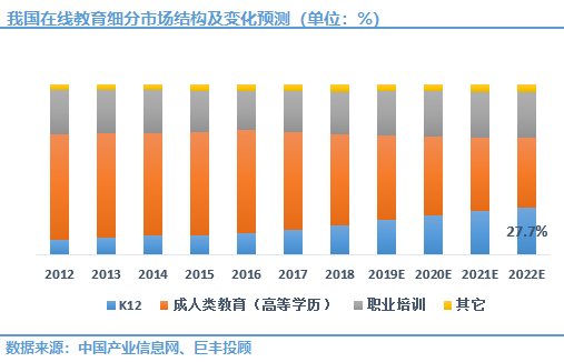 在新一代80、90后父母中,他们的教育意识升级明显,消费能力也有所提高、此外新一代00后、10后孩子对互联网的熟悉具备先天优势,叠加国家二胎政策催生的新生人口红利,K12(学前教育至高中教育,现在普遍被用来代指基础教育)在线教育的接受度和市场规模也呈现出快速增长,预计2020年K12的市场规模也有望突破万亿,同时其在行业中的占比有望提升到28%左右,而高等教育及职业培训的占比下降到68%的水平。