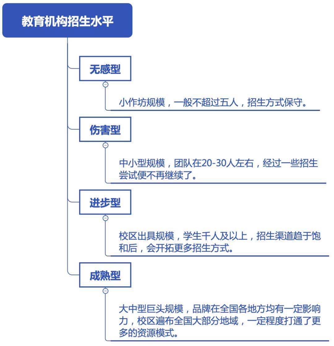 到这个级别可能是校区已经有一定规模,学生有上千人或几千人,机构已经有多个校区和比较成熟的招生体系,一般是地推、专场活动、家长转介绍、口碑相传,以及一些异业交换。经营者的校区一般都会发展的不错,当招生达到一定水平开始饱和时,他们会开拓更多招生方式,也可能尝试一些渠道或者线上产品的方式来解决做大做强的需求。