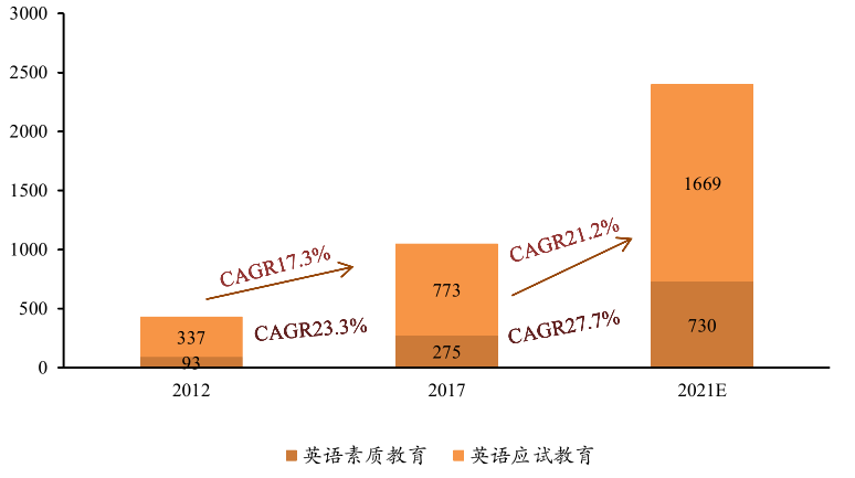 少儿英语市场是千亿级的高增长市场, 应试方向占据主流。