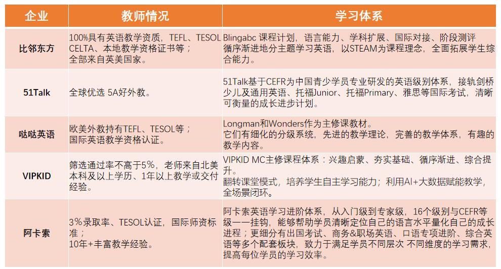 重视研发, 优质教研团队深度打造教研体系。多数头部机构都会重视课程的教研工作,通过教研团队 仔细打磨属于自己特色的教学体系。例如,英孚教育 3-6 岁幼儿英语探索课程历时 2 年研发,横跨 6 国, 近百位国际教研团队深度打造;英孚的10-14岁英语全项突破课程根据英语为第二语言的语言学习者(ESL) 的学习特点研发,帮助提升语言综合实力。贝乐教研团队由全职专业教师组成,除了对课程的研发外,还 会自主研发线上学习平台,通过“技术手段+内容”的结合,产生包含自适应学习、贝乐云学生端、贝乐云 教师端、贝乐云后台服务系统的线上学习平台系统。
