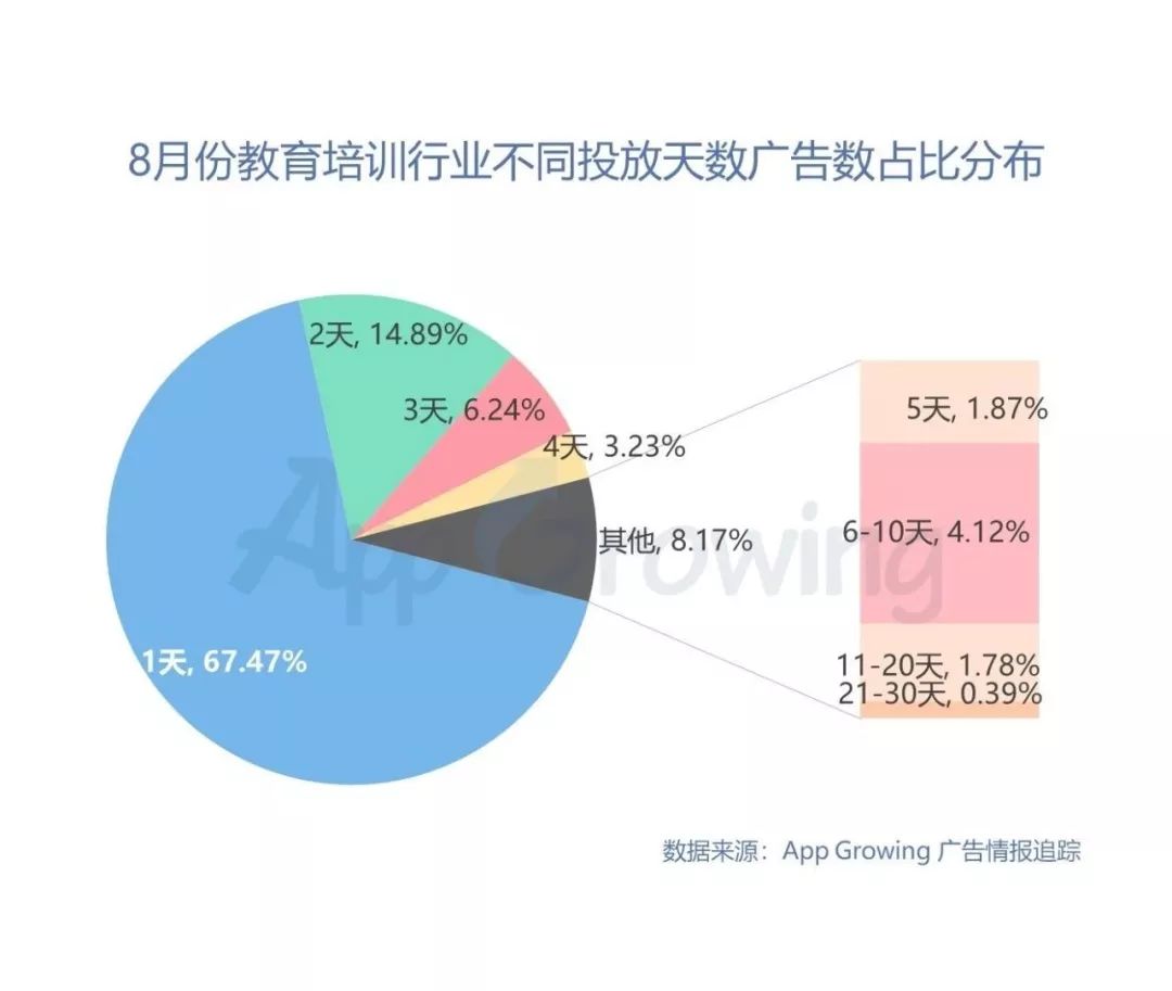 统计8月份教育培训行业单条广告的累计投放天数,其中有67.47%的广告投放天数为1天,投放天数大于5天的广告占比仅6.29%,可见广告素材生命周期较低。