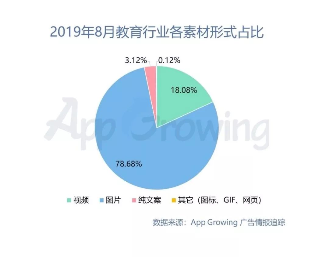 在追踪到的8月教育培训广告中,教育行业素材形式整体以图片为主,视频广告占比近两成,近几个月这一形式占比呈上升趋势,可见教育行业也开始更加注重视频广告这一广告形式。