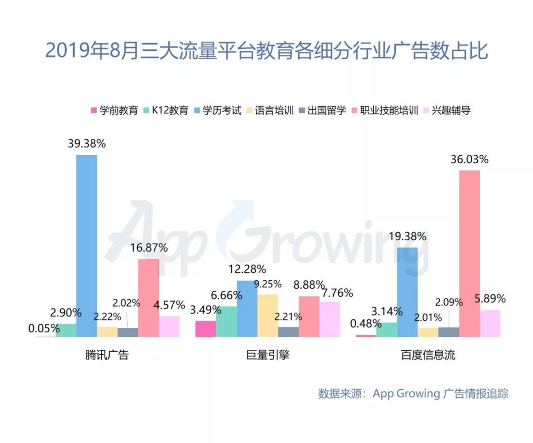 对教育培训行业数据分平台进一步分析发现,腾讯广告以学历考试为主,广告数占39.38%,而百度信息流广告则以职业技能培训广告为主,广告数占比36.03%。