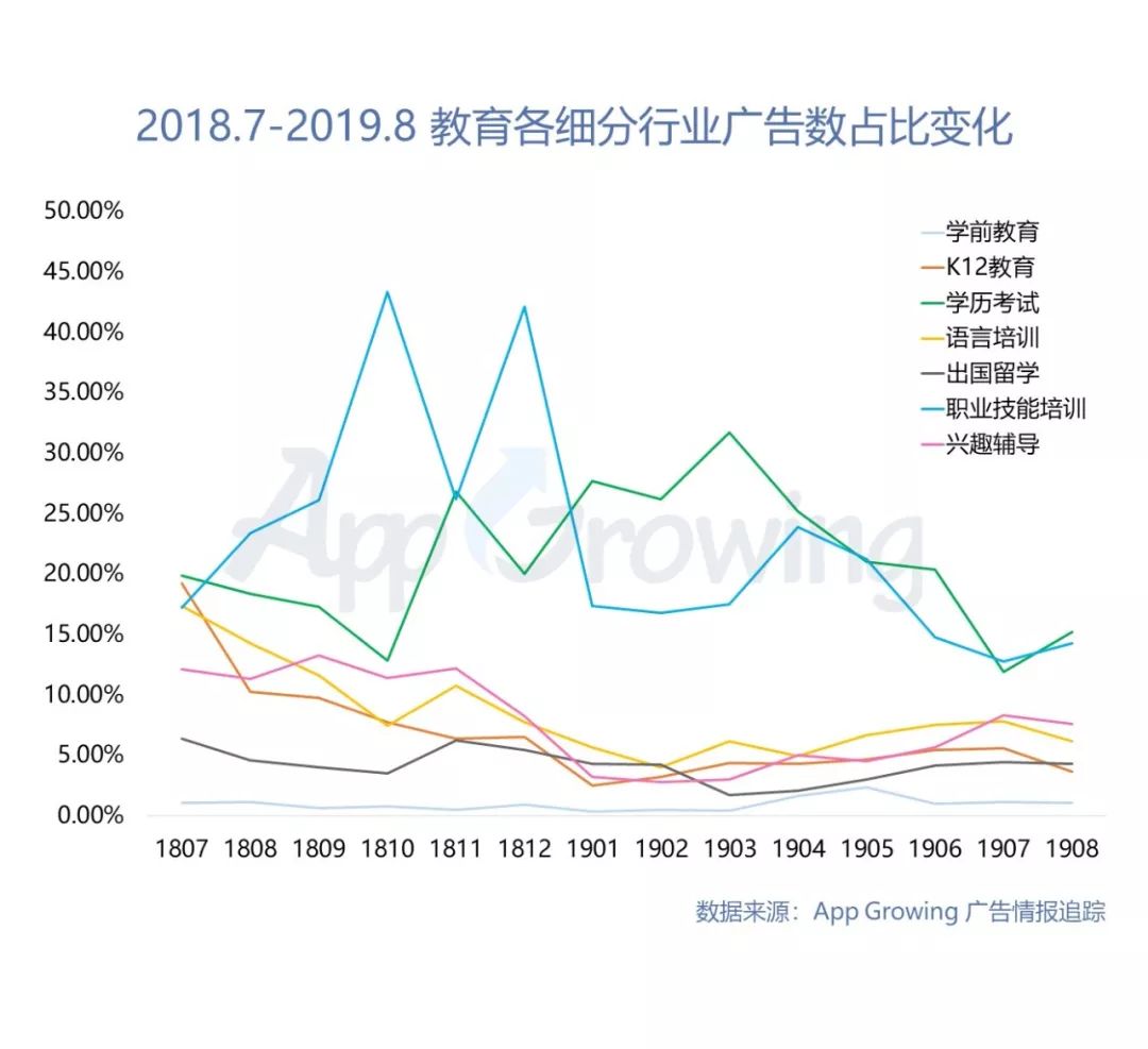 而根据在2018年7月到2019年8月期间追踪到的教育行业广告数数据显示,教育行业的广告数占比也从2018年8月份的4%增长到2019年8月份的8.9%,可见教育行业也较明显加大了移动广告侧的投放。