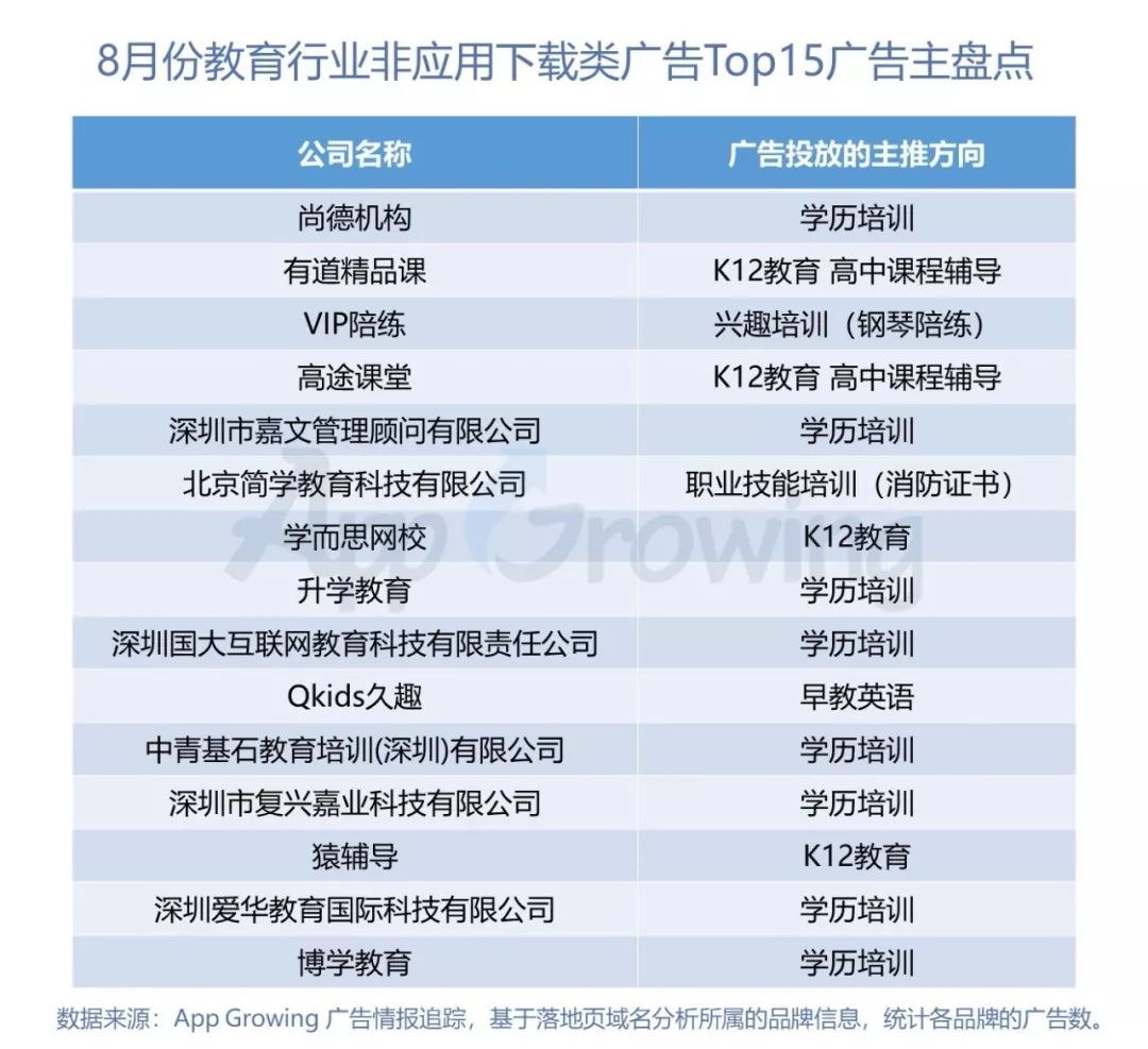 1. 8月非应用下载类广告重点广告主盘点,主推学历培训的广告主占比高