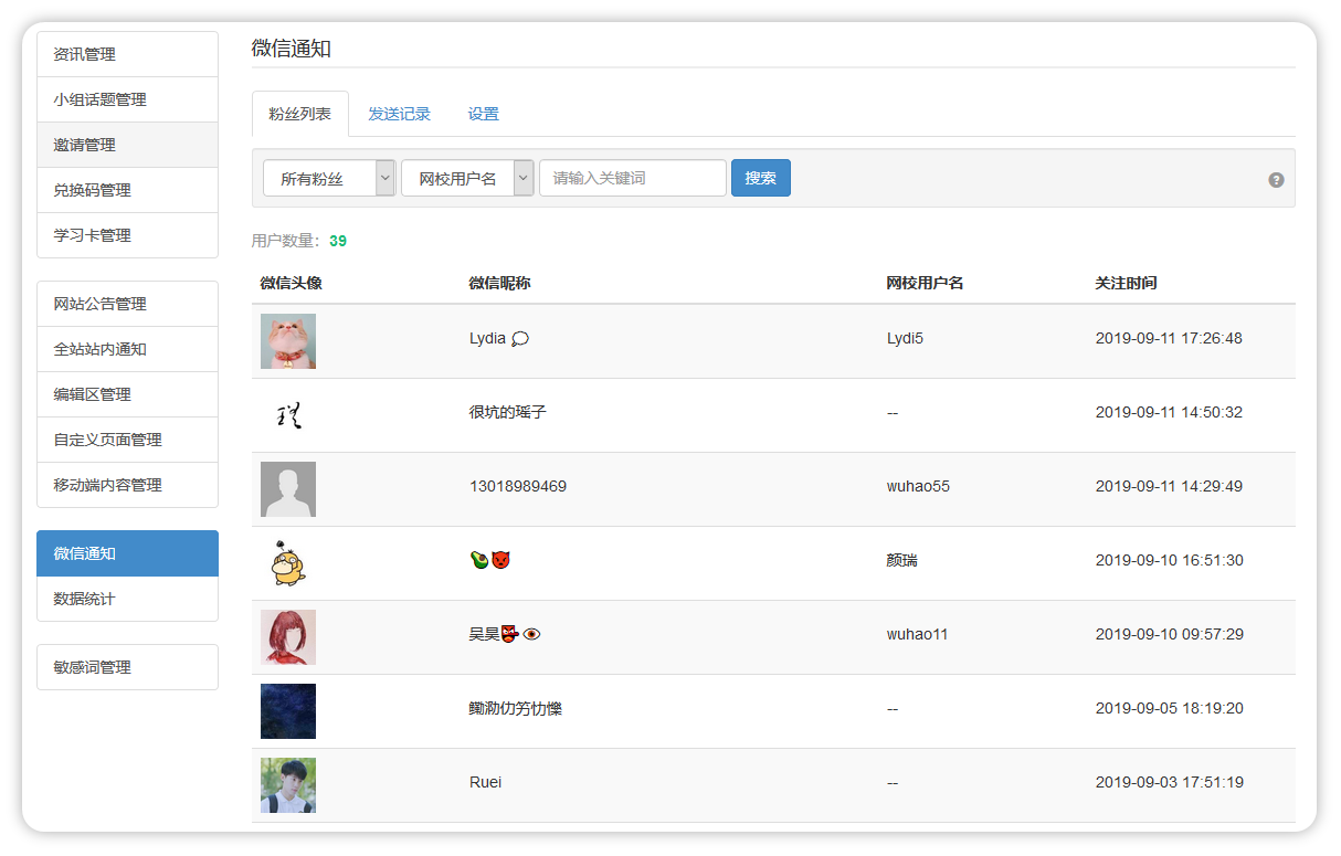 在新版微信通知的管理后台,我们增加了微信公众号的粉丝列表,从这里可以直观查询到公众号的粉丝及其网校用户名,并据此开展针对性运营活动。例如,网校可以通过账号的关联关系,为微信粉丝设定标签,进行针对性的内容推送;或是在微信公众号开展活动时,可以直接查询参与活动学员的网校账号,进行奖品的发放等。