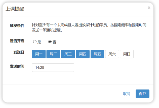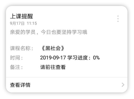 原有的上课提醒仅覆盖了直播课,新版上课提醒则覆盖了全课程。网校通过后台设置发送时间及频次,微信就会针对未完成课程的学员,发送一条上课提醒。