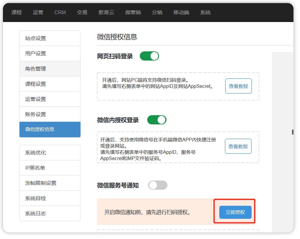 对于已开启微信通知的网校来说,同样建议进行扫码授权,这样可以防止网校服务器IP或消息服务器IP变更造成的通知功能异常。