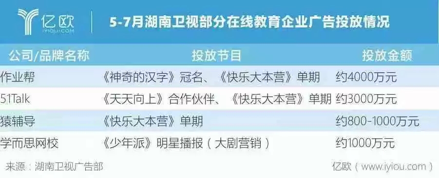亿欧教育了解到,今年5-7月,.、51Talk、.、.网校等在湖南卫视进行了广告投放,仅2个月时间,这些在线教育企业在湖南卫视就投入超1亿元。