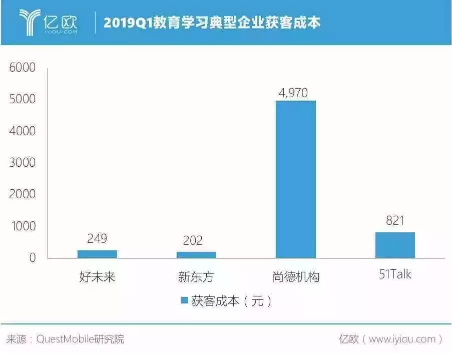 根据QuestMobile发布的《2019在线教育半年报告》,2019年Q1,线上+线下模式的好未来、.,获客成本分别在249元、202元,但是,纯线上的.机构、51Talk,获客成本分别高达4970元、821元。几千元的获客成本在业内已不是秘密。