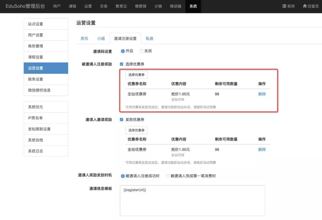 分销引流:网校可以把优惠券和EduSoho分销系统结合,为分销渠道注册的用户,针对性发放课程优惠券,刺激用户注册。
