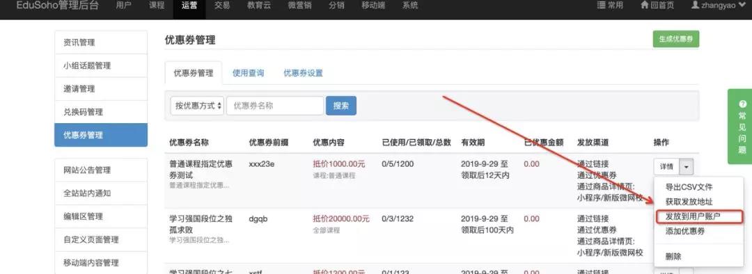 功能入口:运营——优惠券管理——操作——发放到用户账户