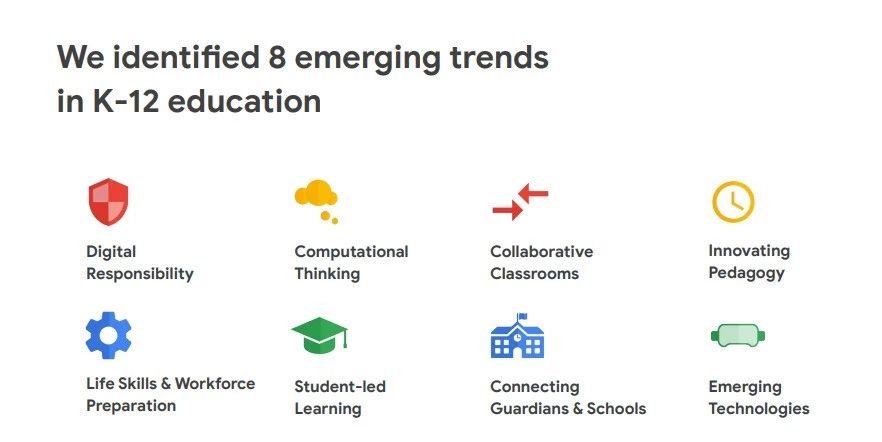 不久前,谷歌教育发布了一份《教室的未来:K-12教育的新趋势(全球版)》报告。该报告的目的是识别和研究世界各地正在发生的课堂教育的研究性转变。