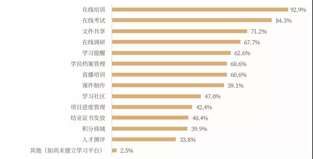 调研显示,97.5%的企业大学已经打造了学习与管理平台,且平台的功能不再仅聚焦“学”与“考”,而是融合了在线学习、培训管理、互动交流、视频直播等多种功能于一体的“一站式”平台。
