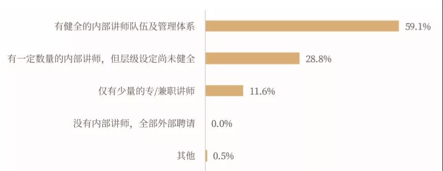 调研结果表明,当前近六成的企业大学“有健全的内部讲师队伍及管理体系”。近年来,企业大学在不断完善讲师队伍体系、革新讲师培养方式的同时,也在尝试打破企业间的界限壁垒,不断整合企业内外师资资源,实现师资共享。
