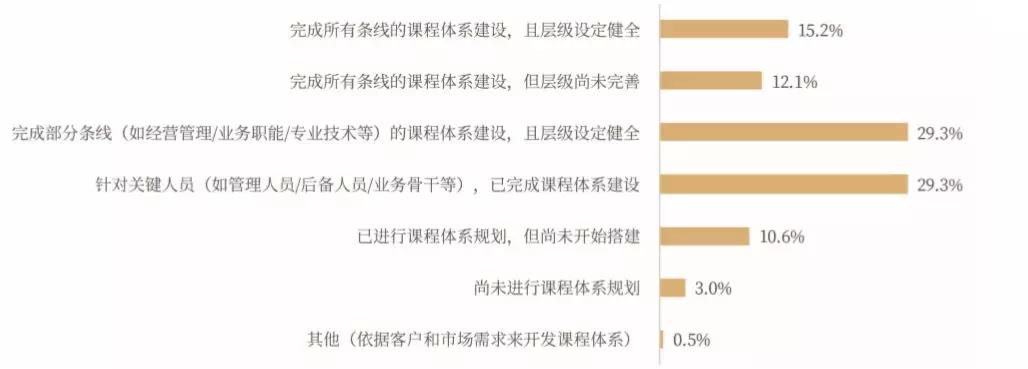 数据结果显示,当前27.3%的企业大学完成了所有条线的课程体系建设。其中,“层级设定健全”的仅占15.2%,这一数据与2017年基本保持一致。