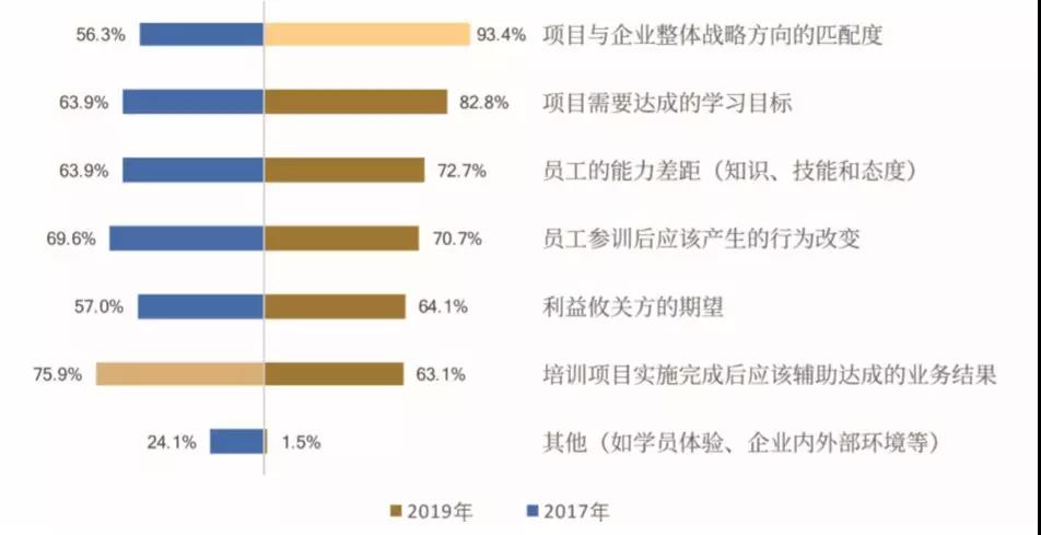 与2017年相比,2019年企业大学设计学习项目时,其考虑因素的占比发生了逆转。当前93.4%的企业大学考虑“项目与企业整体战略方向的匹配度”,而此因素在2017年排名最低,反之亦如此。