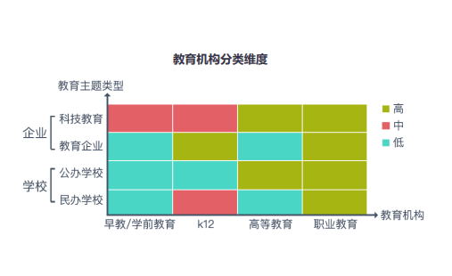 教育机构的分类有许多种, 但可以从两个维度进行分析, 一个是教育阶段,另一个是教育主体类型。其中在教育阶段包括:早期/学前教育、K12、高等教育、职业教育;而在教育主体类型则包括 学校(民办/公办) 、企业(科技教育/教育企业)。
