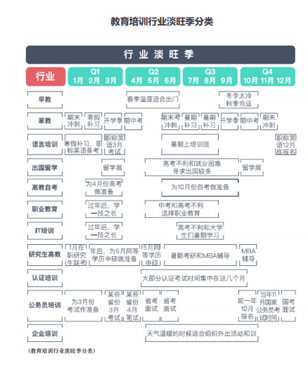 据致趣百川2019《教培行业获客白皮书》显示,教育培训行业是有一个生命周期式的,但由于学生年龄不同,需要不同,行业生命周期也不尽相同。以早教行业为例,由于孩子年龄较小,适合出门季节据有周期性,冬季太冷、秋季、春季适宜,所以旺季会在4、5、6、9、10月。