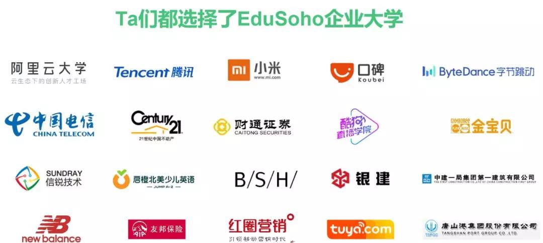 目前,EduSoho已帮助阿里、腾讯、京东、小米、字节跳动等众多企业打造企业大学。