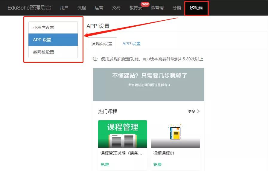 新版移动端内容的管理位置为【移动端-APP设置】与小程序和微网校的管理内容在一起,可以更好的整合移动端3个入口的内容,清晰明了。