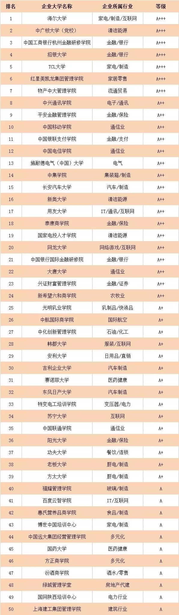 有权威机构制定出16条全方位的测评维度,包括业务支持、人才培养、培训预算、知识沉淀等标准。那么中国有哪些优秀的企业大学?真正的企业大学是什么样的?从全国231家企业大学中评选出最优秀的50家企业大学,这些企业涵盖金融、制造、IT、通信、房地产、医疗、石油化工、建筑、能源、零售等诸多行业,代表目前中国企业大学的发展水平和未来趋势。