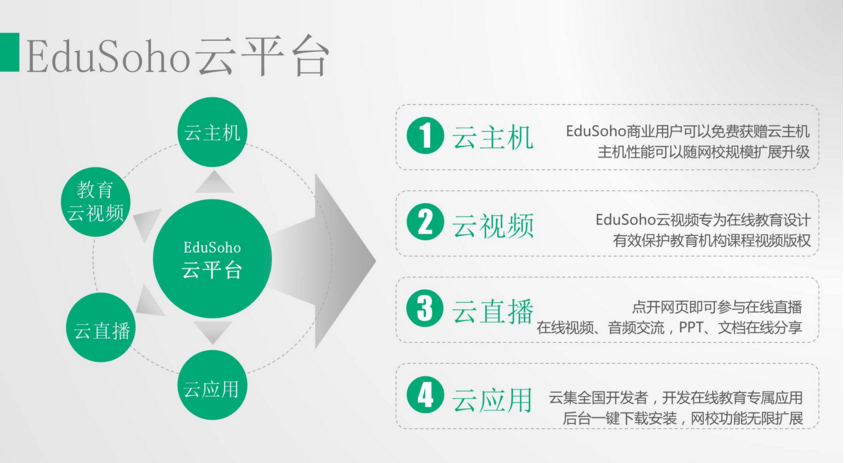 EduSoho教育云服务是基于EduSoho开放云平台,面向EduSoho用户提供的搭建网校相关的云服务,包括云主机、教育专用云视频、云直播、云应用等。