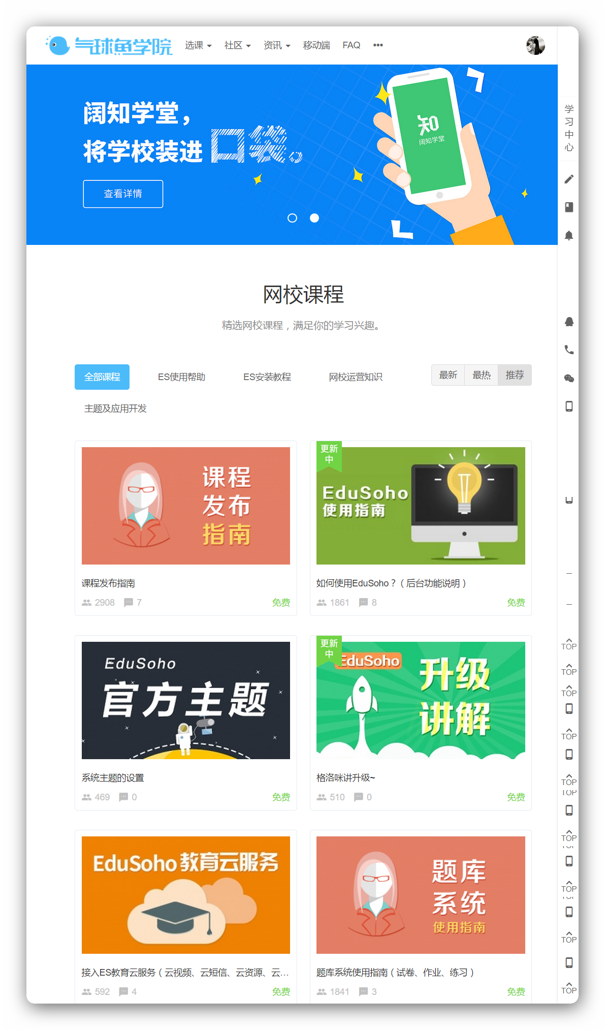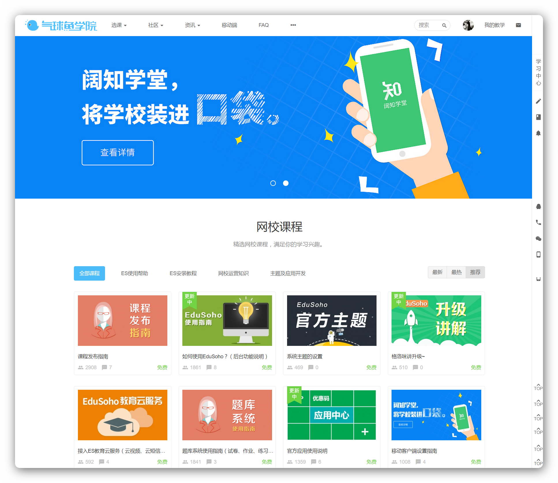 EduSoho移动客户端是基于EduSoho主程序的内容,针对现代人手机使用频繁化,碎片化的特点而进行开发的移动学习工具。他的内容和WEB端主程序无缝连接,学员可以在不同的终端进行学习,真正做到时时学习,处处学习,最大化利用碎片化的时间进行学习活动。