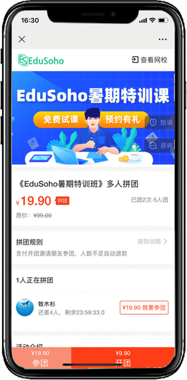 价格:活动的价格,是很多参与者最关心的问题之一,除了有好的口碑课做铺垫,价格直接决定了买家的下单购买率。例如我们可以通过对正价格降价拼团来发起活动。