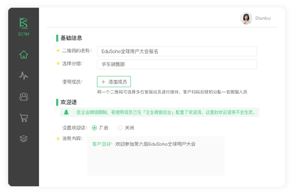 企业可以借助EduSoho销客助手(SCRM系统)的员工活码功能来设置渠道标签,针对不同的来源渠道生成不同的活码,用户扫描活码进入私域流量池后,系统会自动为其贴上渠道标签,并为各个分类配置一个或多个专属的运营人员,便于企业查看和分析各个渠道的引流效果。