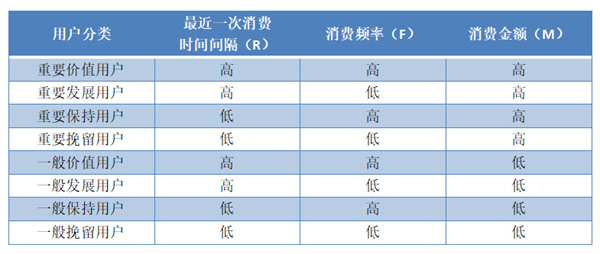 这个是一个相对高级的综合标签,需要综合考虑用户多方面行为,用于对用户进行分类分层。这里可以用RFM模型来对用户进行等级的划分。