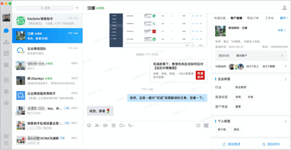 3. 提升日常工作效率可以根据客户标签,结合EduSoho销客助手中的企业话术、个人话术等功能,将常见问题的答案配置到系统内。当业务人员遇到类似问题时,能够快速找到答案并发送给客户,提高服务效率。