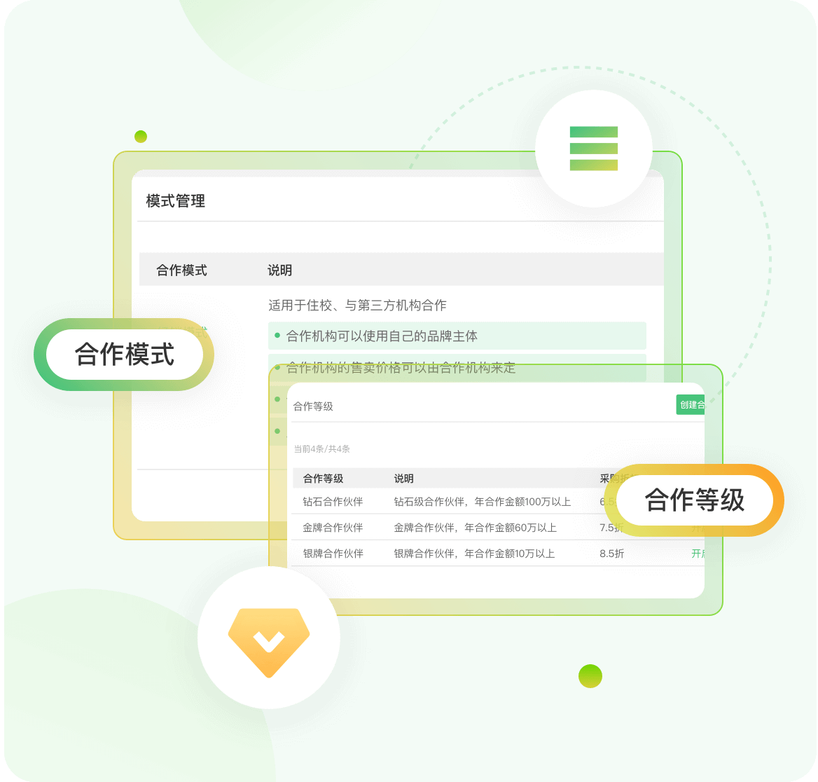 EduSoho分课支持开设教培子站点和企培子站点,同时支持品牌强管控和弱管控两种模式,满足不同的合作类型诉求。