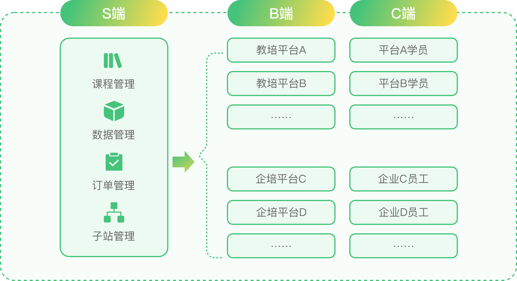 EduSoho分课是EduSoho研发的在线教育多站点管理系统,包含供应管理平台及多个子站点,能够帮助企业进行在线教学产品的分发及管理,从而打造S2B2C经营模式。